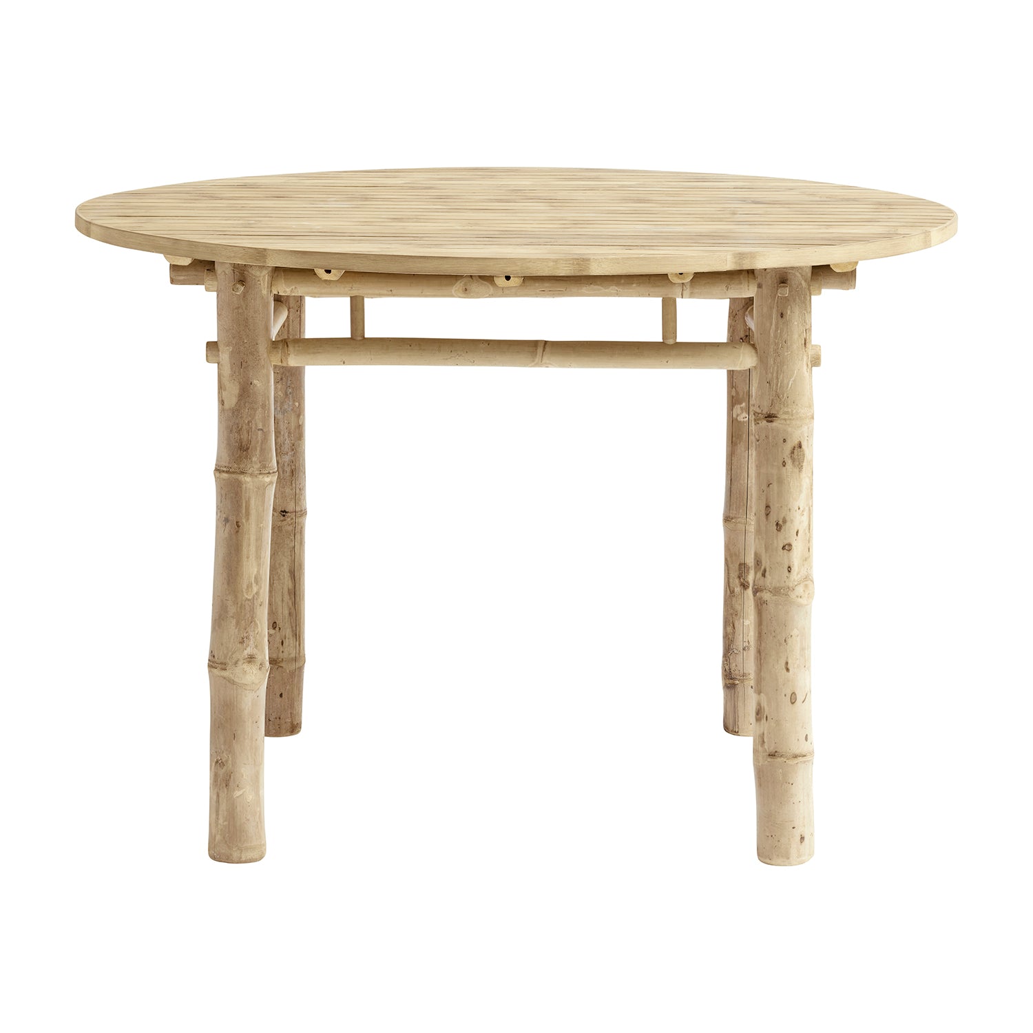 Round bamboo dining table for both indoor and outdoor use. The table's organic shapes and natural material give life and cosiness to the home.