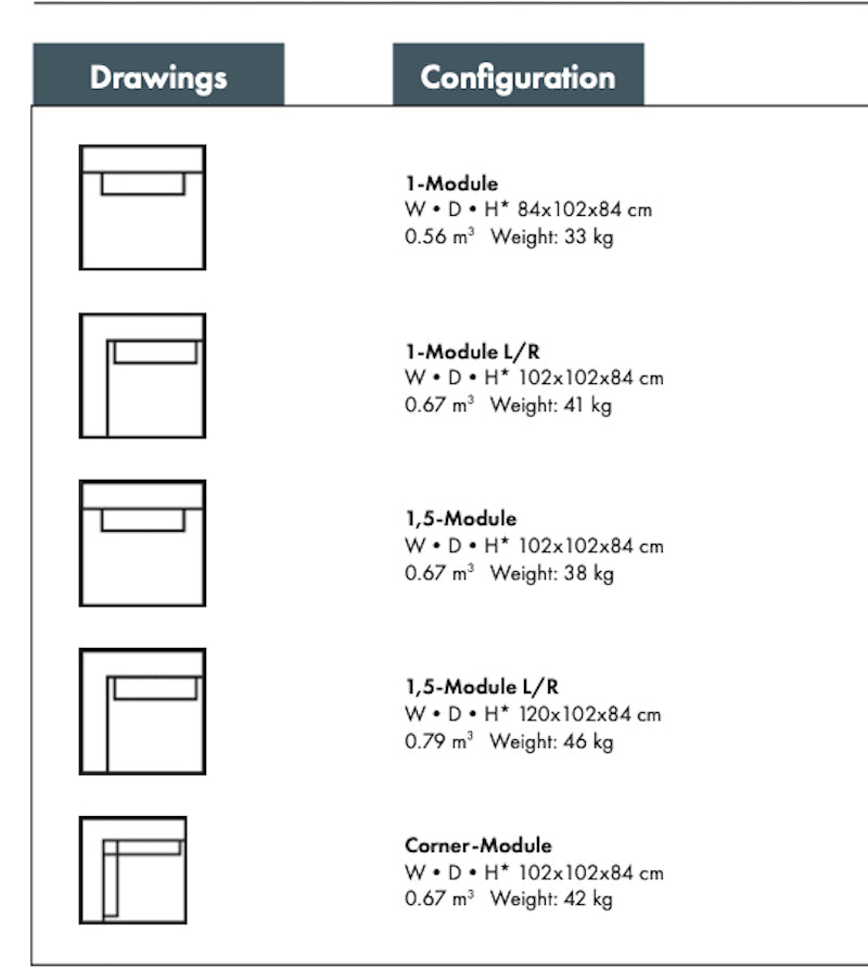 Sold as individual modules (priced per module) in several shapes and sizes and available in different fabrics including leather (for an extra charge please email us). Prices shown are for fabrics in group A, there is a slight increase for groups B and C fabrics of around 10-15%, please email us for a PDF showing all the fabric colours in greater detail or for fabric samples.